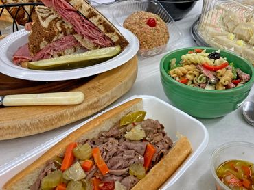 Made with our fresh roasted meats roast beef, baked ham, corned beef & turkey breast with sliced cheeses and our “Famous” Potato Salad. Rolls/Breads sold separately.