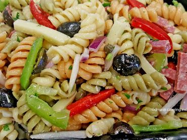 Spiral pasta, hard salami, provolone cheese, black olives, bell pepper, red onion, parmesan cheese, Italian marinade