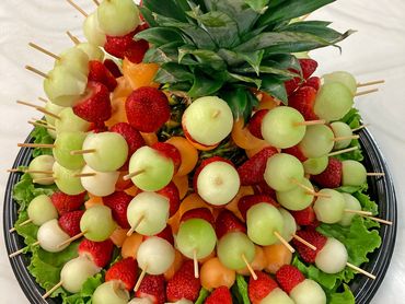 Melon and strawberry kabobs surrounding a whole pineapple filled with fresh pineapple cubes. Makes for a perfect centerpiece.